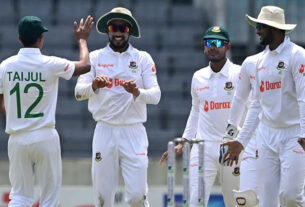 বোলিং: শরিফুল ১০-০-৫১-২, তাসকিন ৯-১-৪৩-২, সাকিব ১০-১-৩৭-১, মিরাজ ৪-০-১৭-০, মুস্তাফিজ ১০-১-৩৬-২, মেহেদি ৭-০-৪০-২)।
