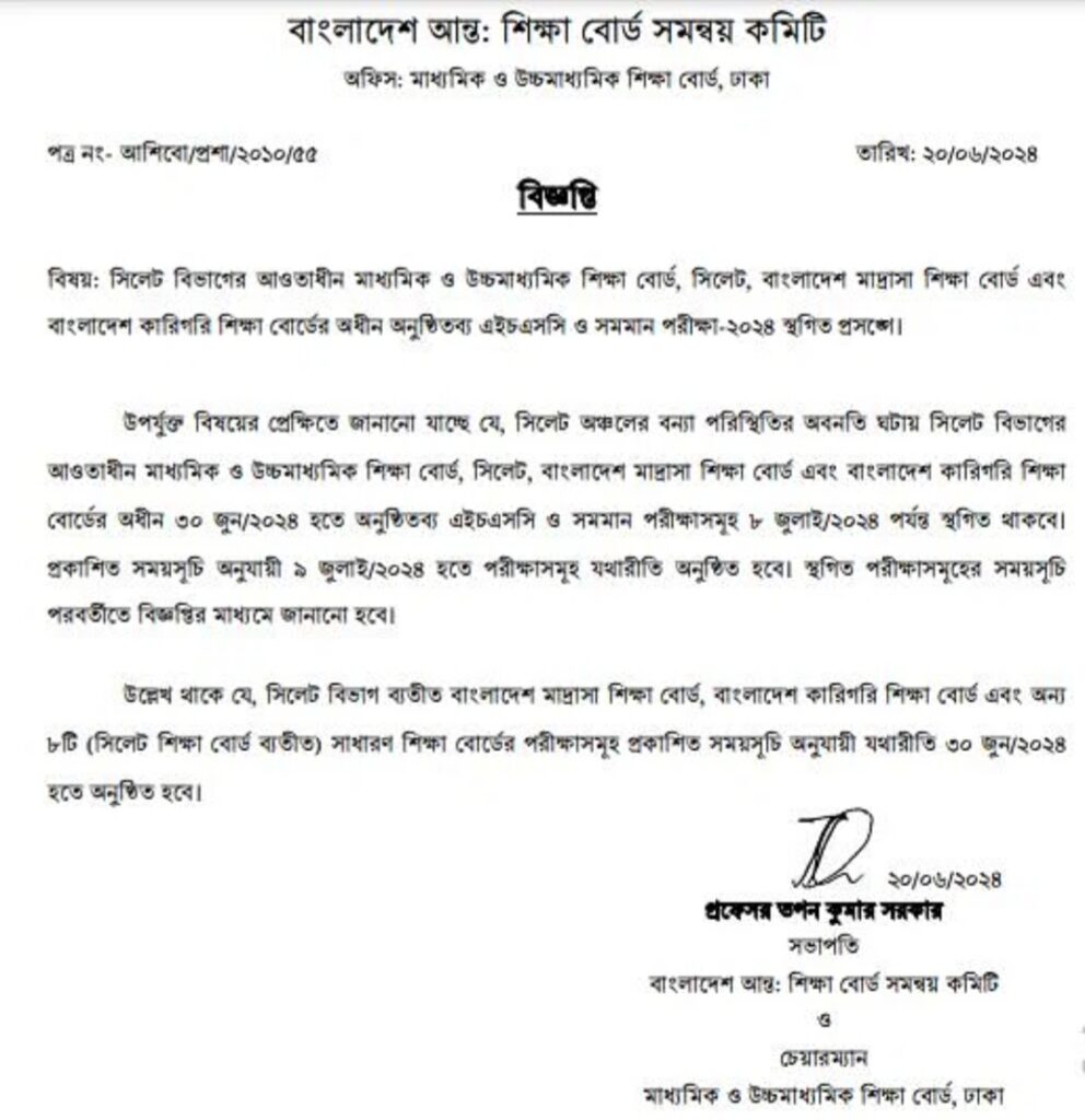 সিলেট বিভাগের স্থগিত পরীক্ষার প্রশ্নপত্র এসব সেট থেকে ছাপিয়ে নতুন সময়ে পরীক্ষা নেওয়া হবে। অনুরূপ ব্যবস্থা হবে মাদ্রাসার পরীক্ষার ক্ষেত্রেও।